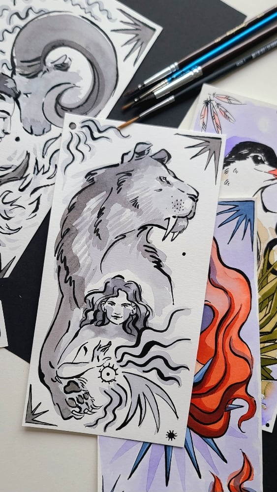 En suivant mon intuition, guidée par un échange autour de votre personnalité, de vos symboles, de vos couleurs intérieures et de votre animal totem, je crée pour vous une illustration à l’encre, sensible, accompagnée d’un mot poétique sur sa signification.